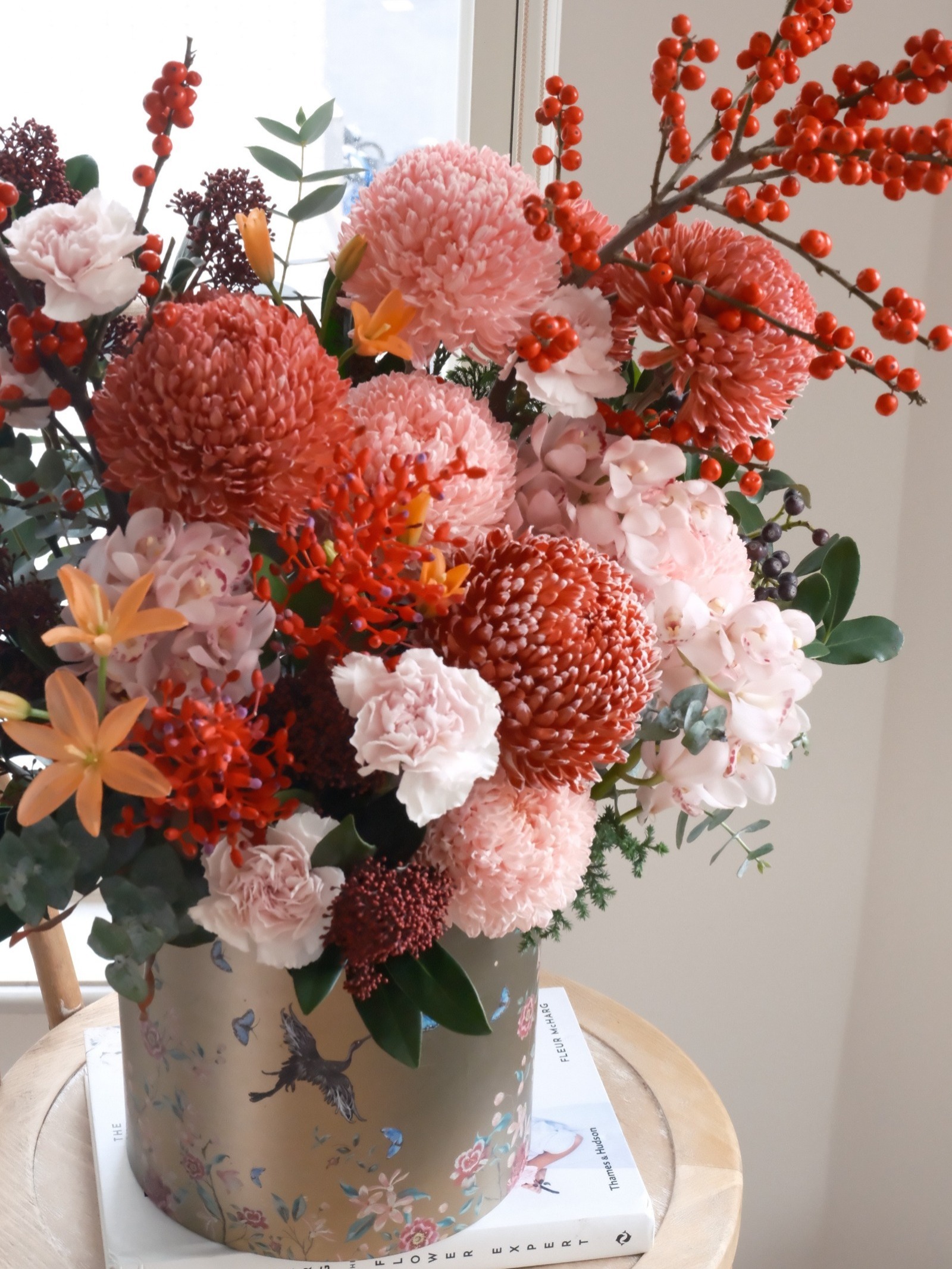 是專為春節期間所設計的花藝,為日常生活增添一份過年的儀式感,讓過年的節慶氣氛更多了氣質與生氣,很適合用來拜年送禮或是商業空間佈置,營造出春節氛圍的迎賓感受!