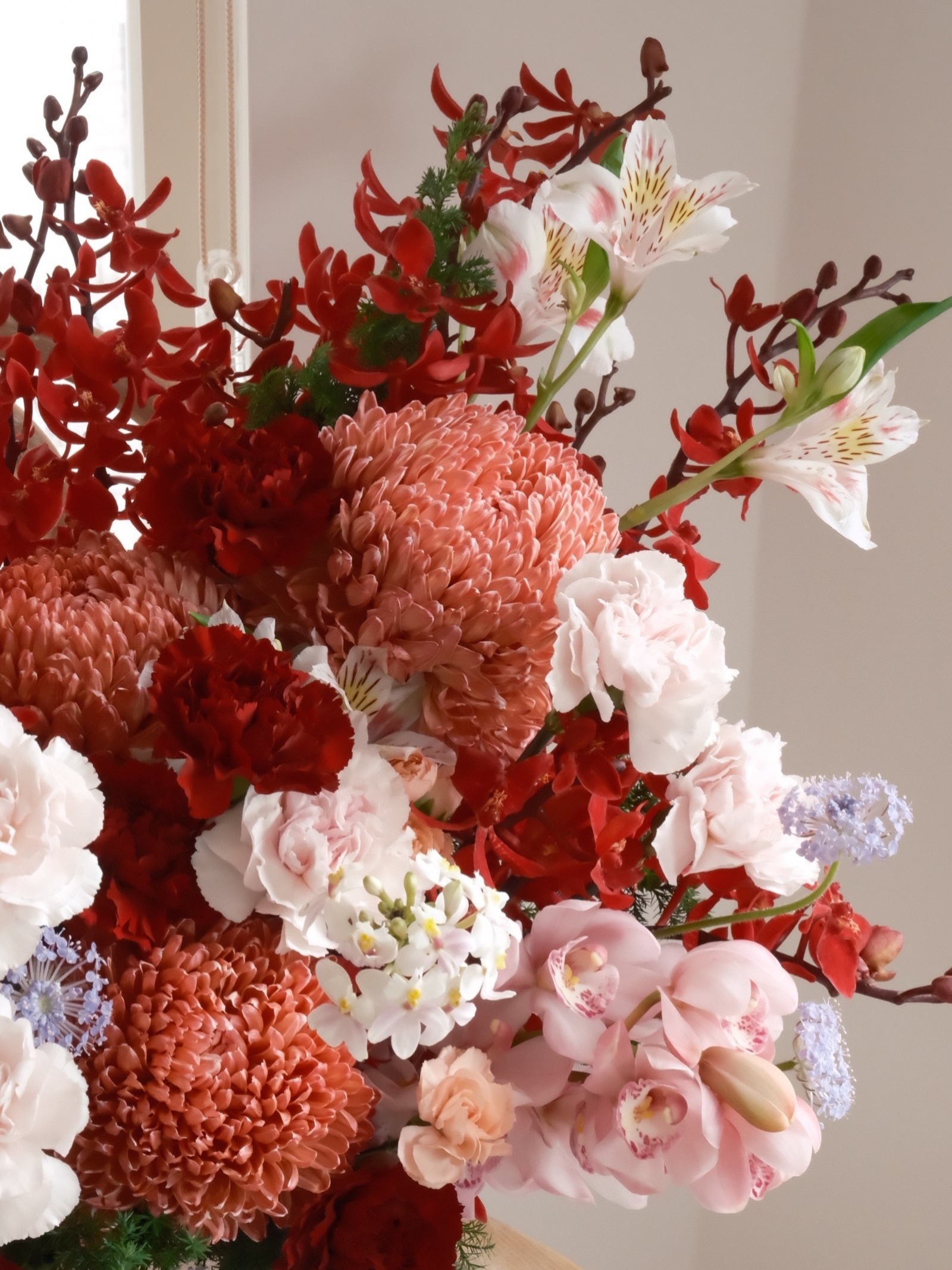 | 紅粉色系 | 牡丹菊、冬青 | 長壽、吉祥、源源不絕 | 客廳玄關、公共空間 |