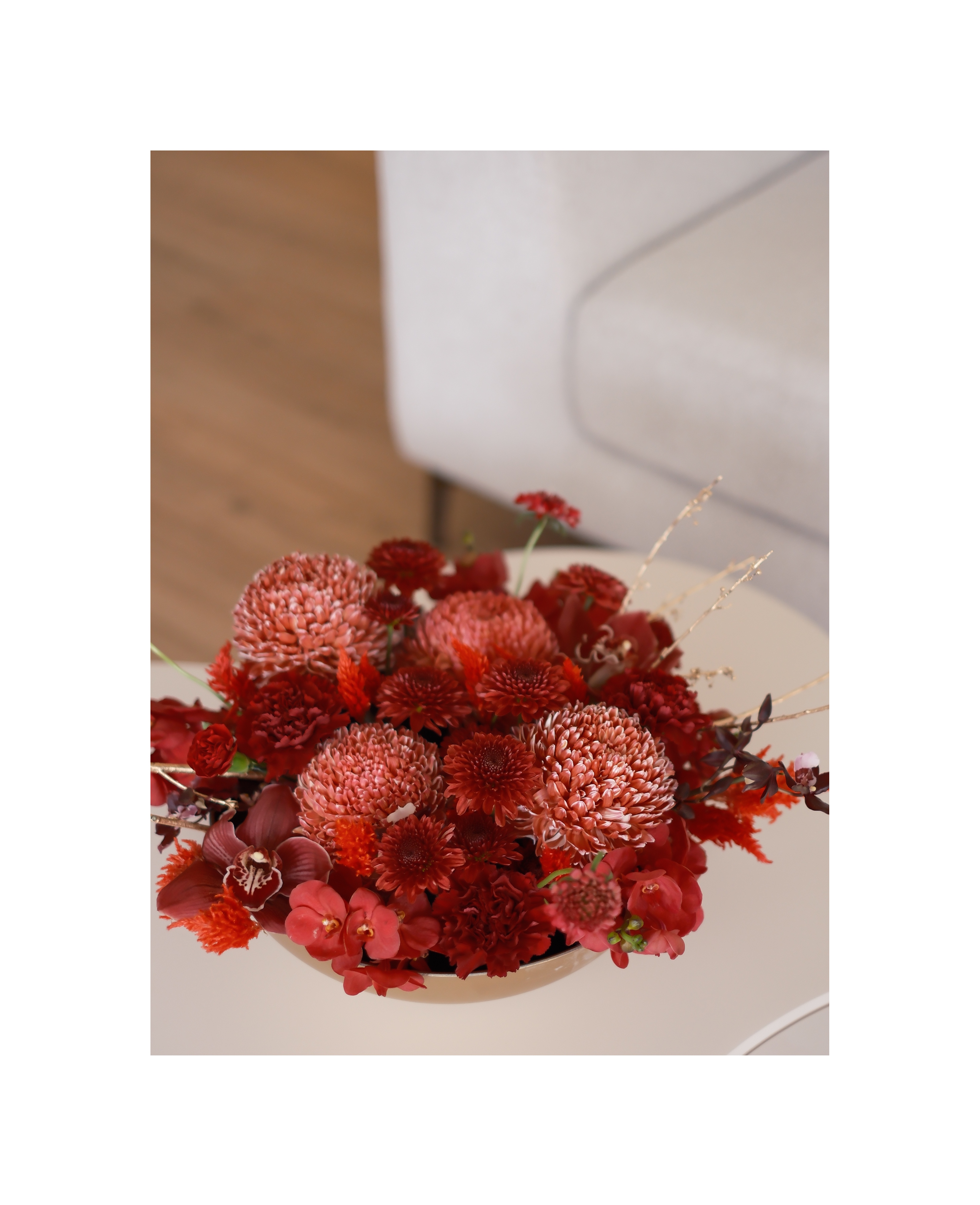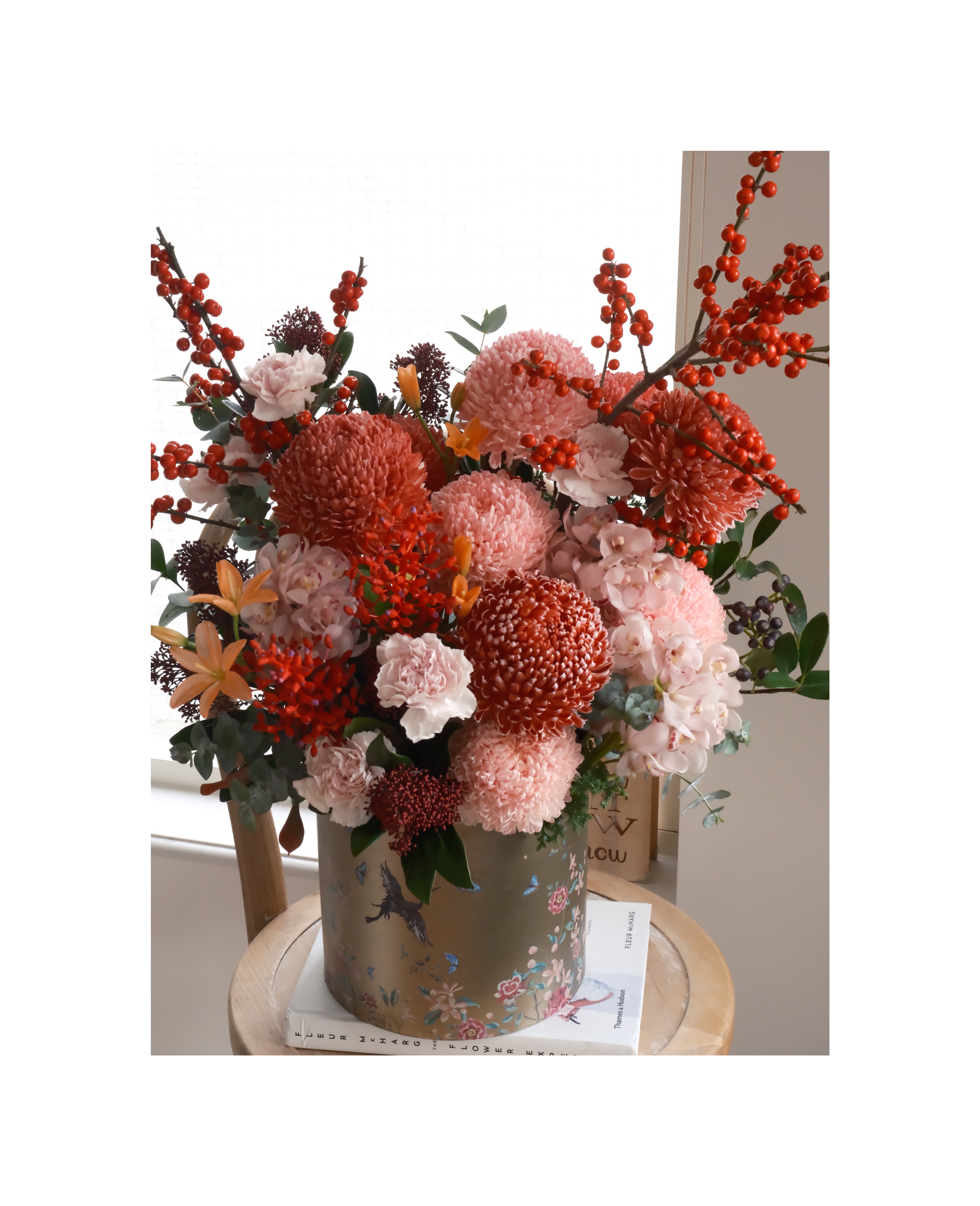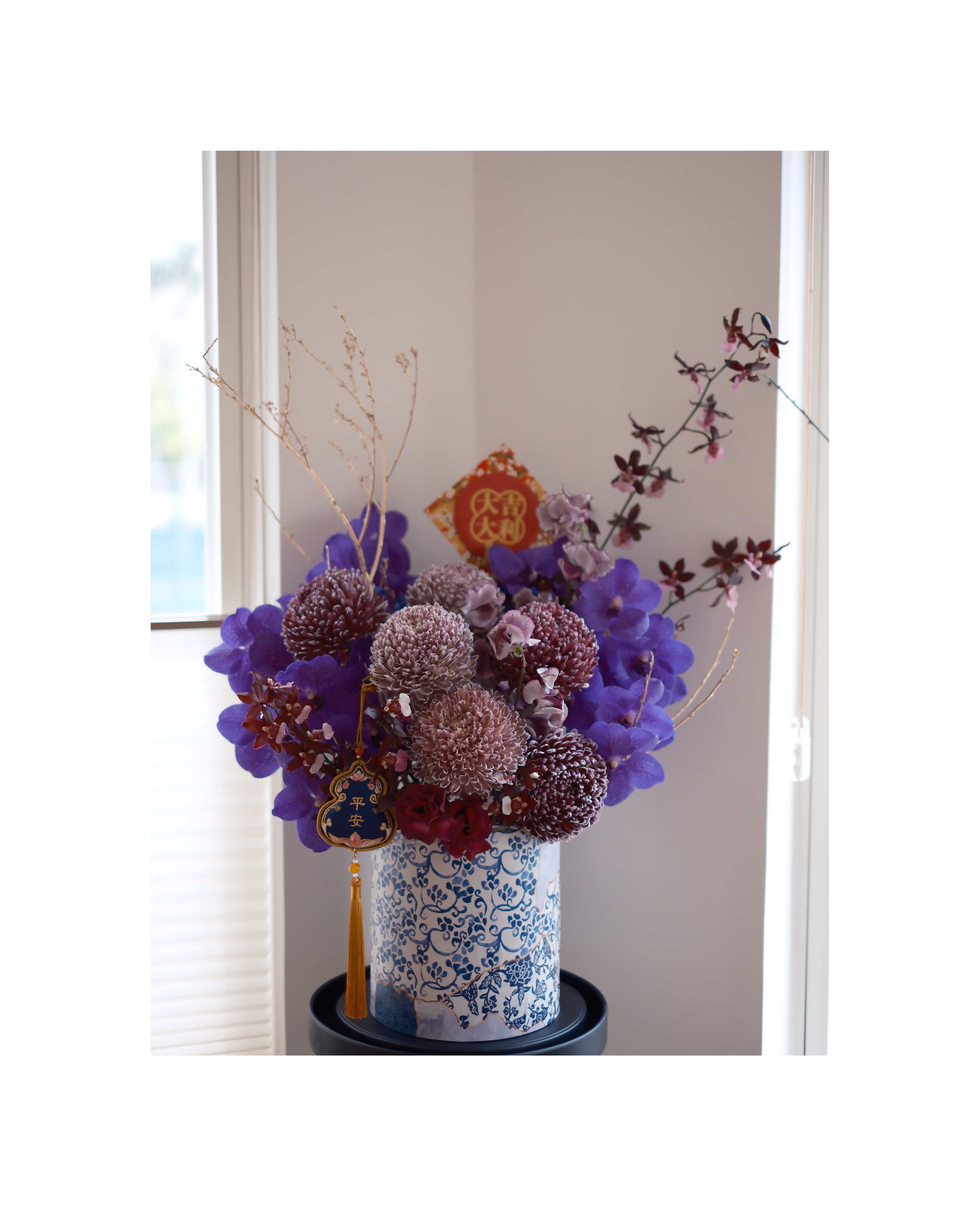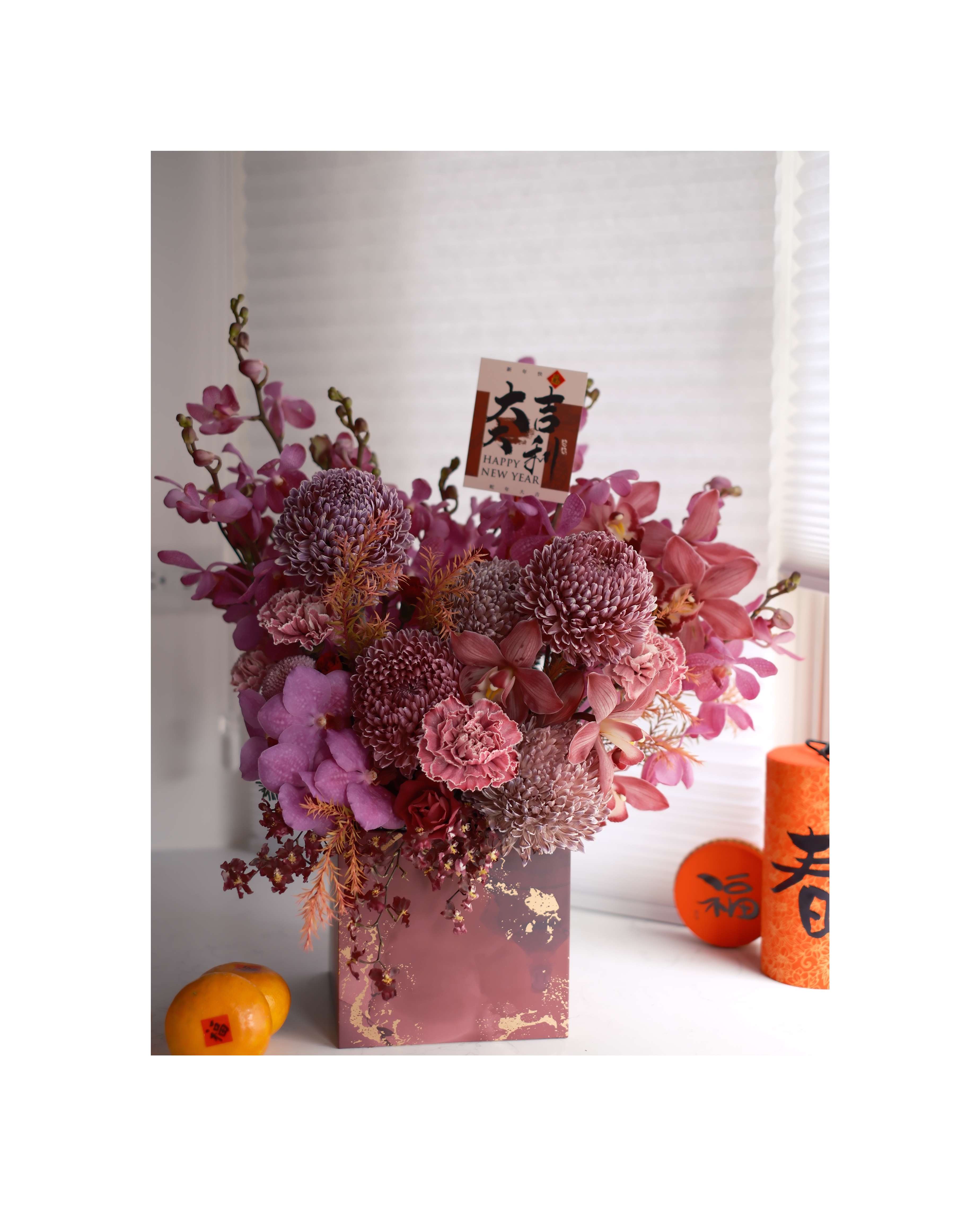 馬到成功事事順, 財運滾滾福氣來。 今年茱力安花禮設計了年節花禮, 與大家一同期待馬年到來, 先祝福大家佳節愉快! 主要花材為牡丹菊、荷蘭東亞蘭, 因花藝師會定期至花市採買新鮮花材, 所以其餘花材依照花市現有花材有所改變, 敬請包涵見諒! 照片內金色花器為示意圖。 花禮尺寸約為 50x20 CM。