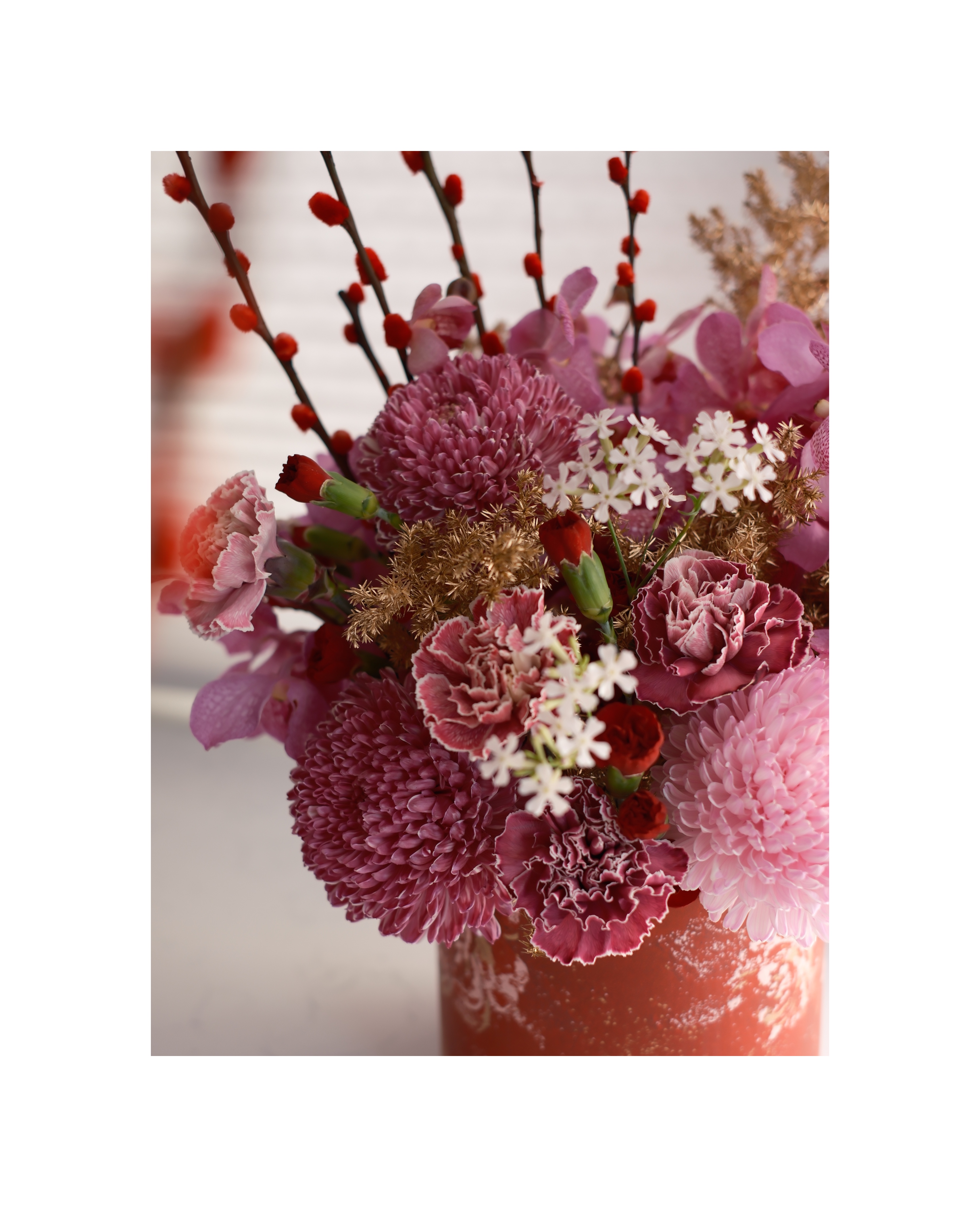馬到成功事事順, 財運滾滾福氣來。 今年茱力安花禮設計了年節花禮, 與大家一同期待馬年到來, 先祝福大家佳節愉快! 主要花材為牡丹菊、荷蘭東亞蘭, 因花藝師會定期至花市採買新鮮花材, 所以其餘花材依照花市現有花材有所改變, 敬請包涵見諒!